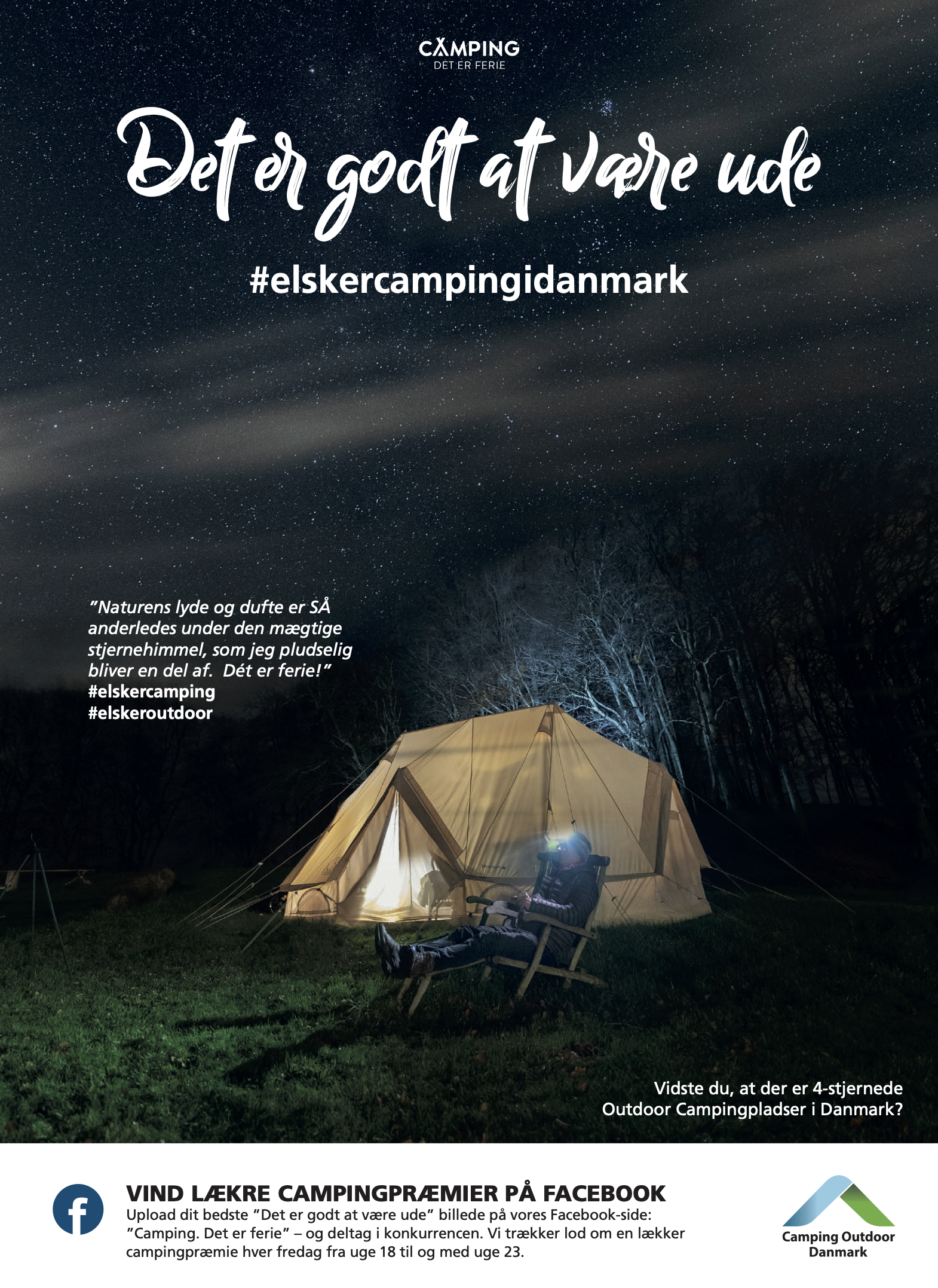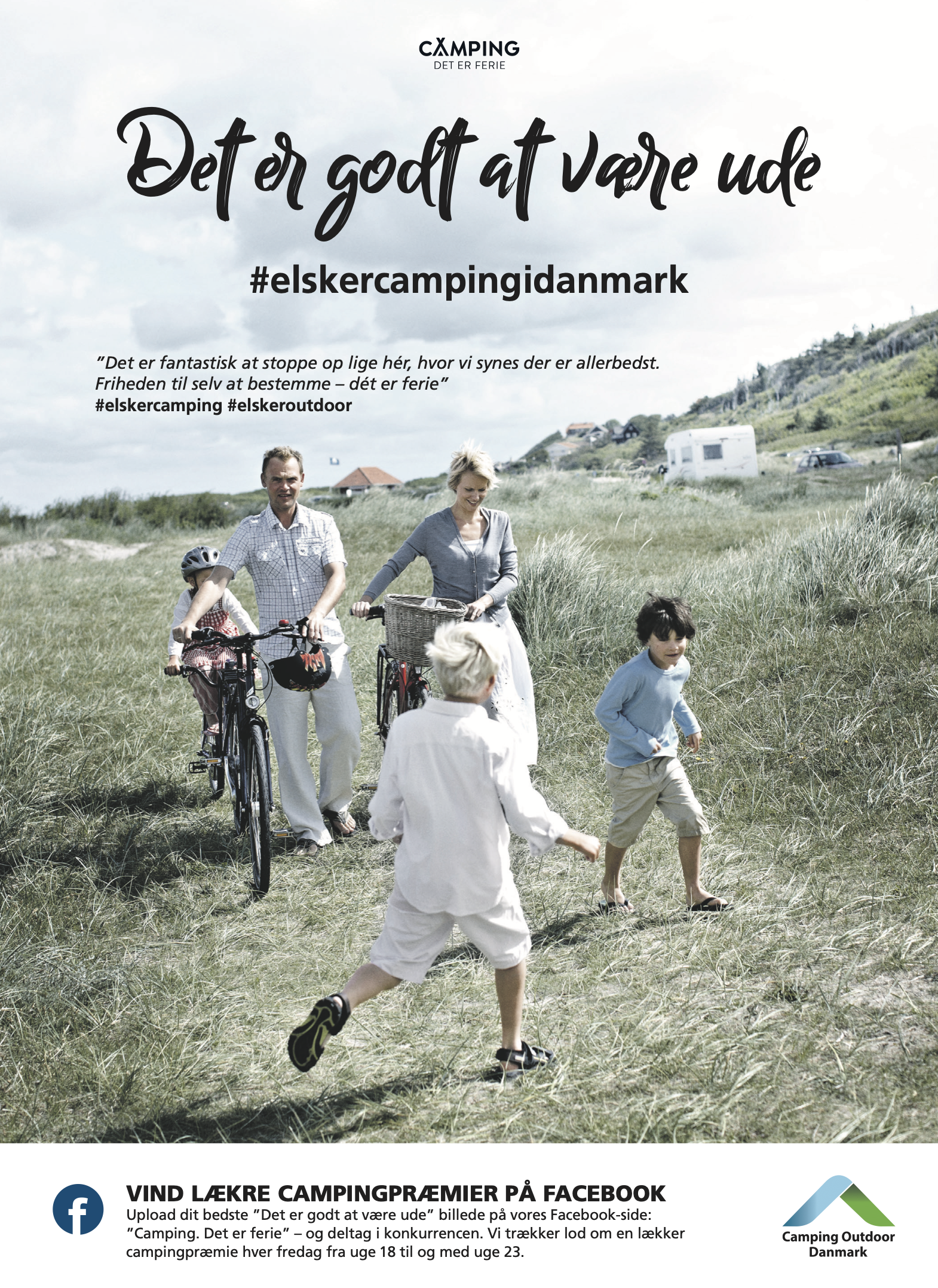 ”Camping. Det er ferie” - er overskriften. “Det er godt at være ude” er budskabet, som skal vise, at camping er en ferieform, som er tryg, relevant og meget attraktiv i disse coronatider. Vi har i en lynindsats brugt de forhåndenværende billeder og budskaber, som brandingudvalget har udarbejdet.